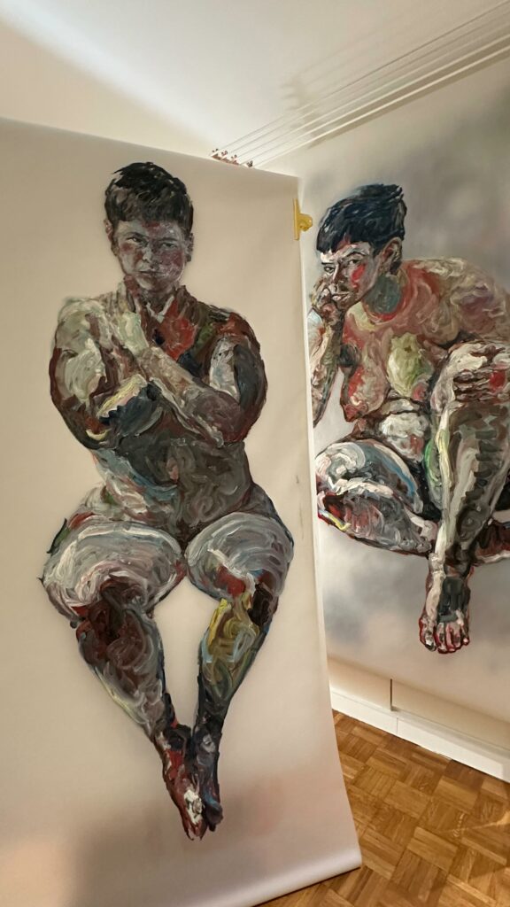Fangyou Belleli paints time—not its passage, but its pulse. Known for her large-scale portraits and nude studies painted live in 5 to 20 minutes, she works in oil on translucent tracing paper, capturing presence as it flickers and fades. Each stroke is a transmission—breath, energy, light.